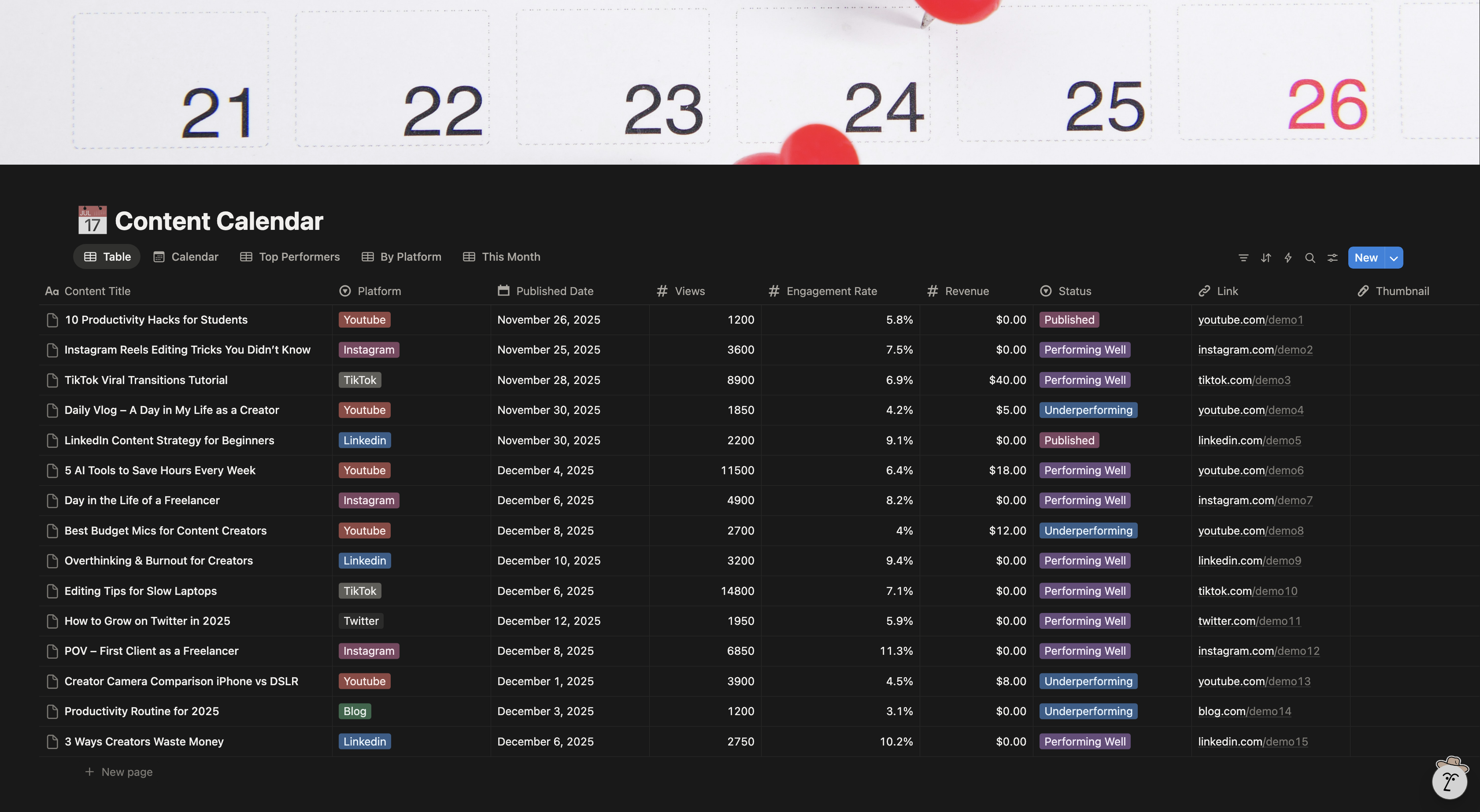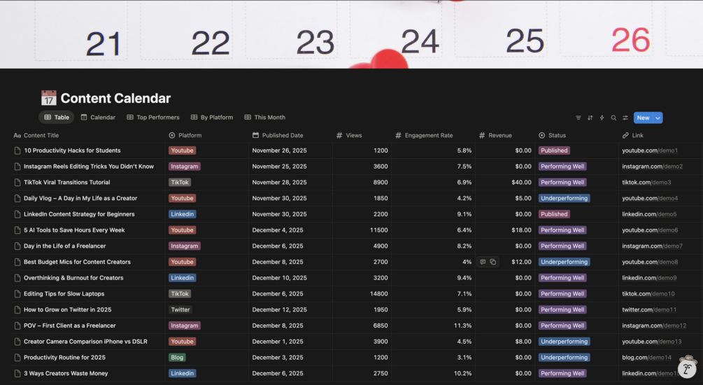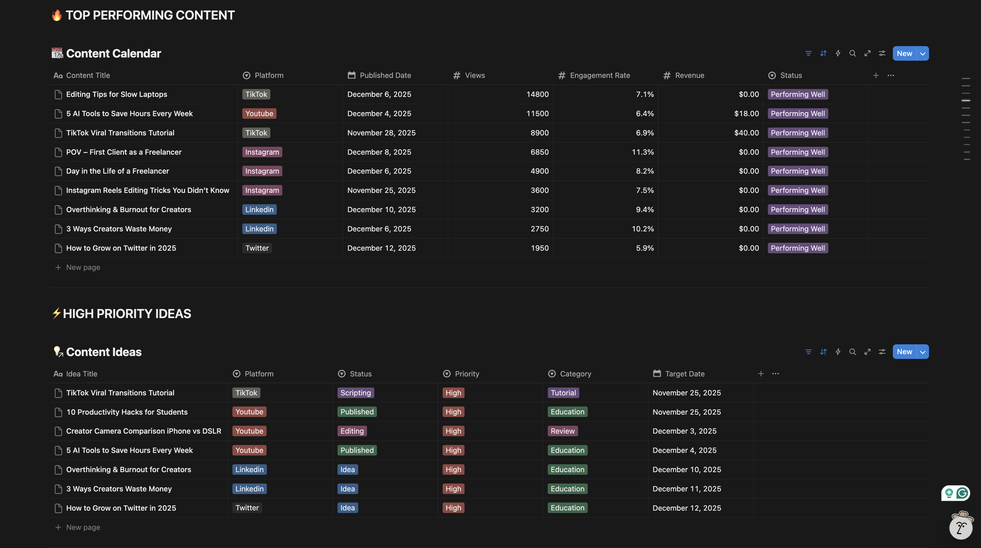 🎥 CONTENT CREATOR DASHBOARD — NOTION TEMPLATE