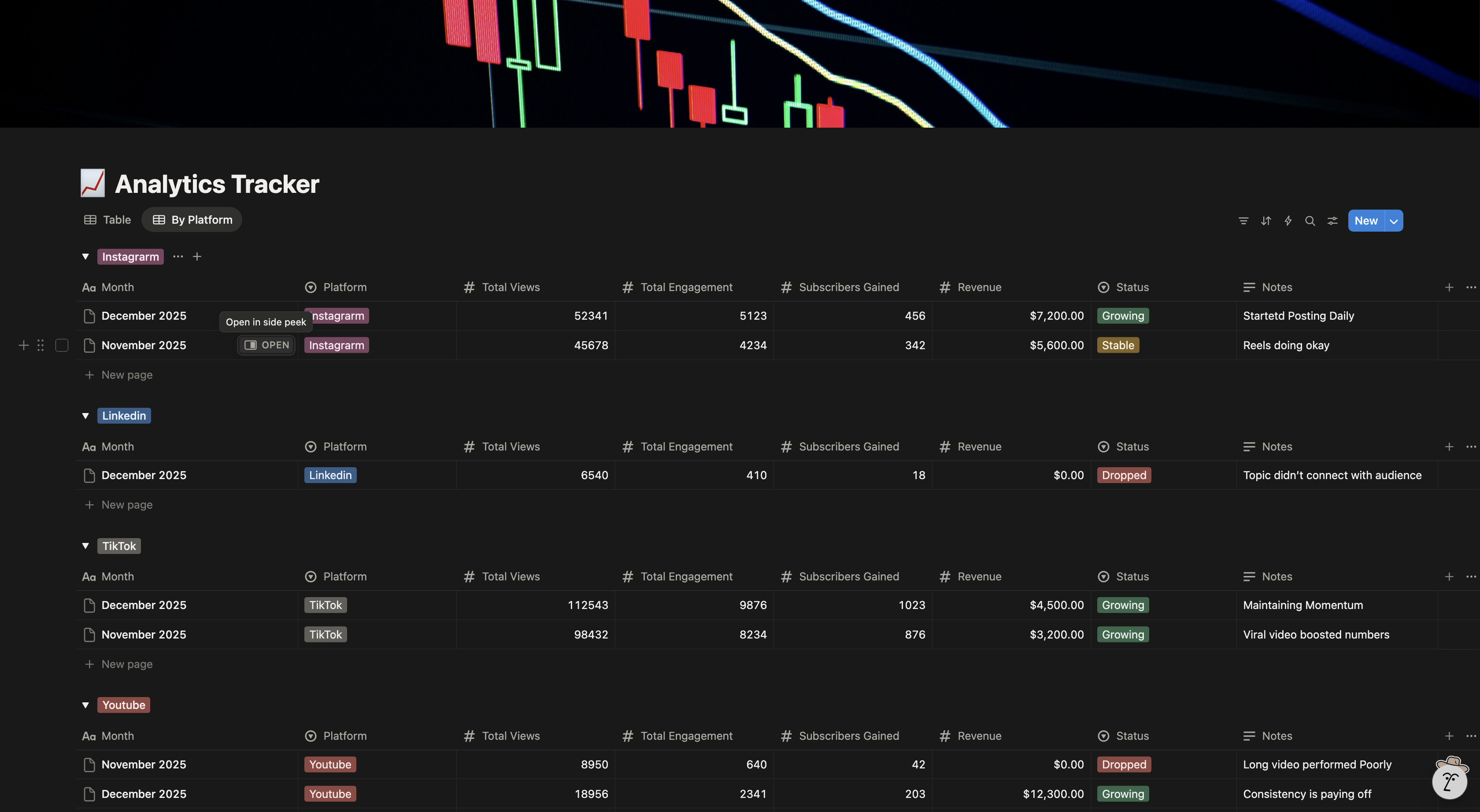 - Track monthly performance by platform